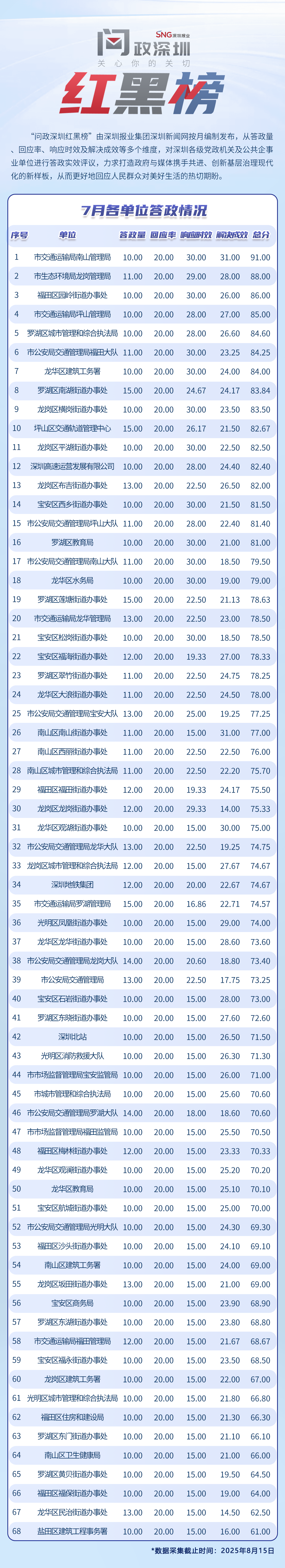 榜單煥新首期,展示2025年7月所有涉及單位在“深圳論壇”答政情況: