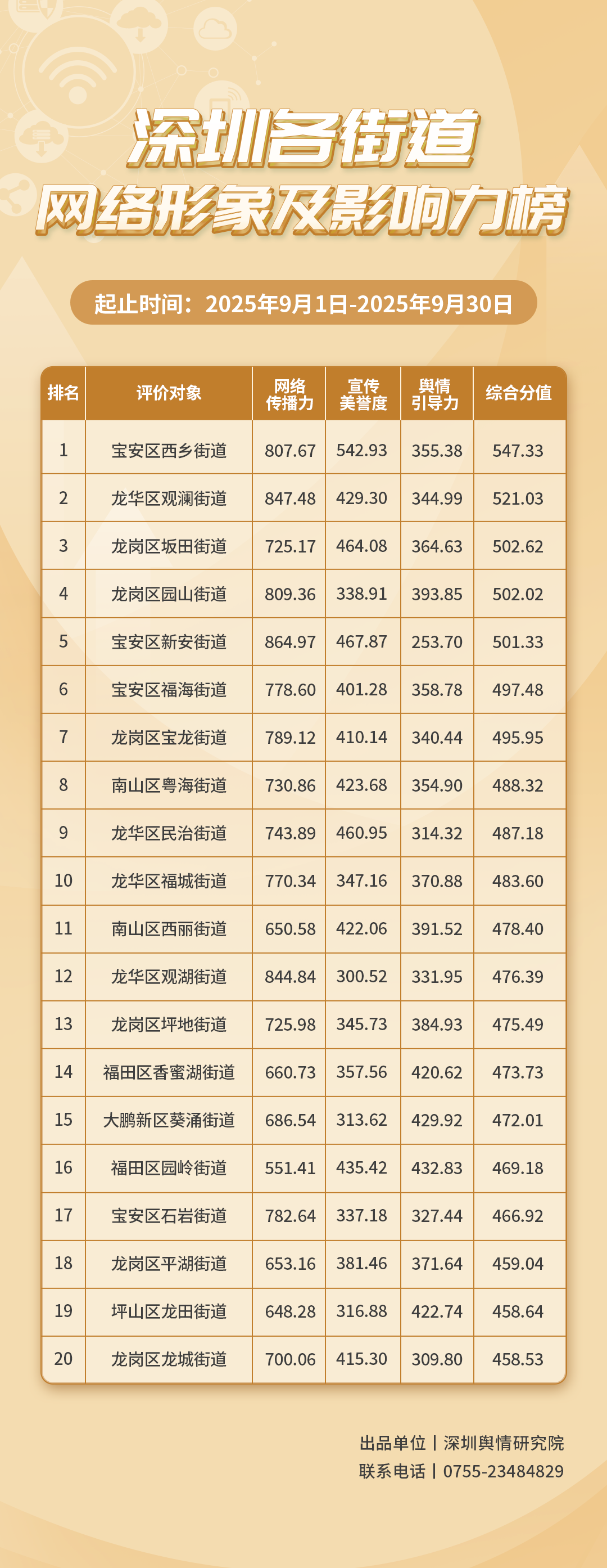 9月街道網(wǎng)絡(luò)形象及影響力榜:龍崗、寶安、龍華共攬14席