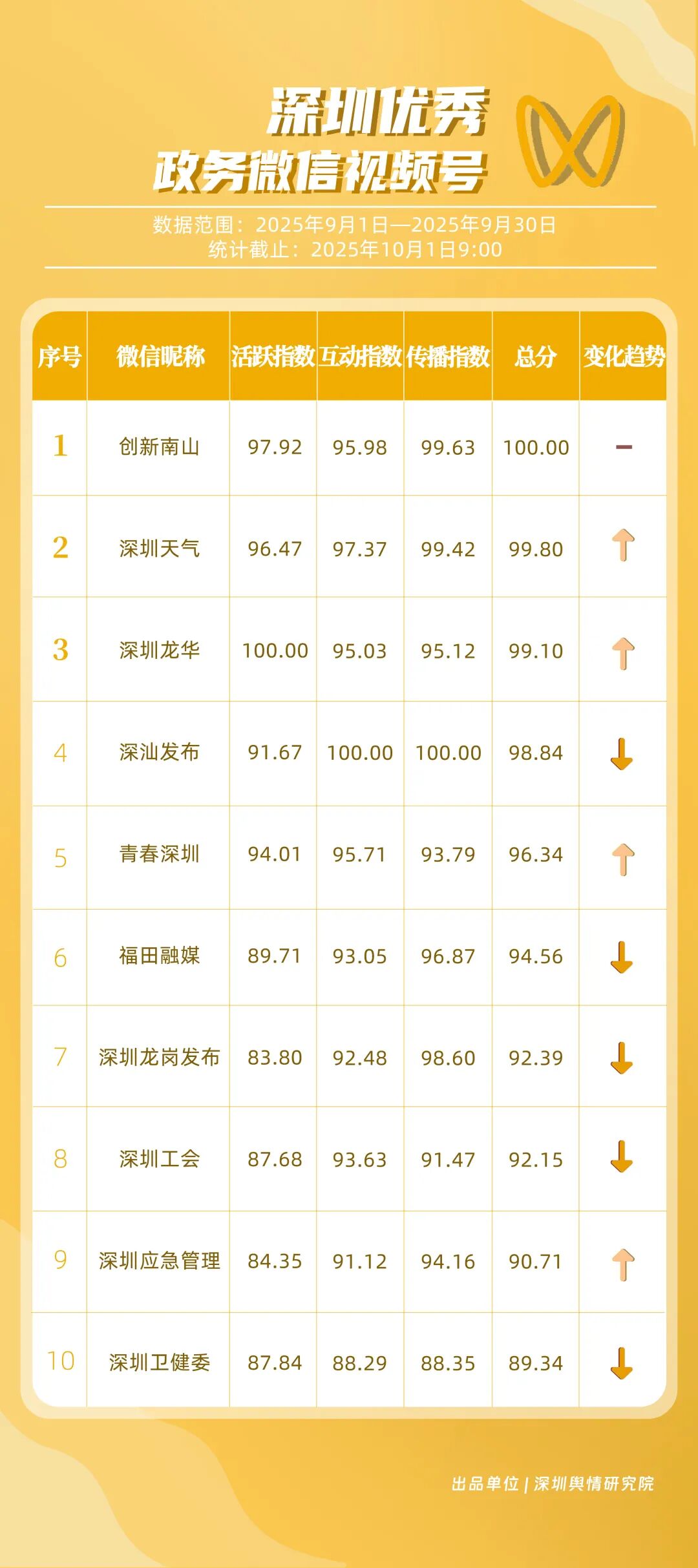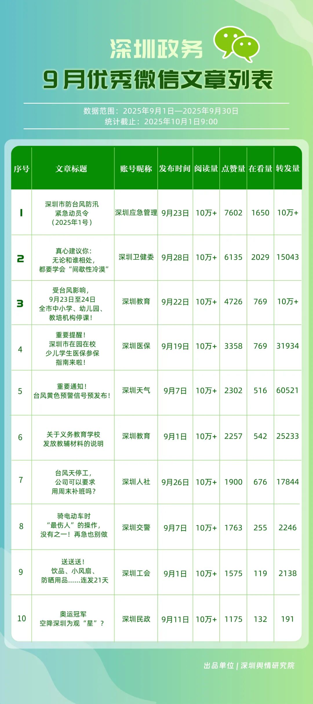 9月,“深圳衛(wèi)健委”“深圳龍崗發(fā)布”“幸福福田”“i深圳”“青春深圳”“深圳工會”“深圳教育”“深圳交通”“創(chuàng)新南山”“深圳應急管理”等30個政務微信公眾號榮登“深圳優(yōu)秀政務微信公眾號”榜單。9月,“深圳衛(wèi)健委”以總分100.00的成績蟬聯(lián)榜單首位,其憑借突破常規(guī)視角的選題,解讀專業(yè)健康知識,引發(fā)大量網(wǎng)民共鳴,內容質量與傳播力形成雙向賦能;“深圳龍崗發(fā)布”以總分93.24位居第二,聚焦區(qū)域民生服務升級等動態(tài),信息觸達率不斷提升;“幸福福田”圍繞商圈經(jīng)濟復蘇、文化節(jié)慶活動等主題開展系列宣傳,增強區(qū)域活力展示,位列第三;“i深圳”“青春深圳”“深圳工會”等也持續(xù)優(yōu)化賬號內容,通過實用信息推送強化政務服務定位。