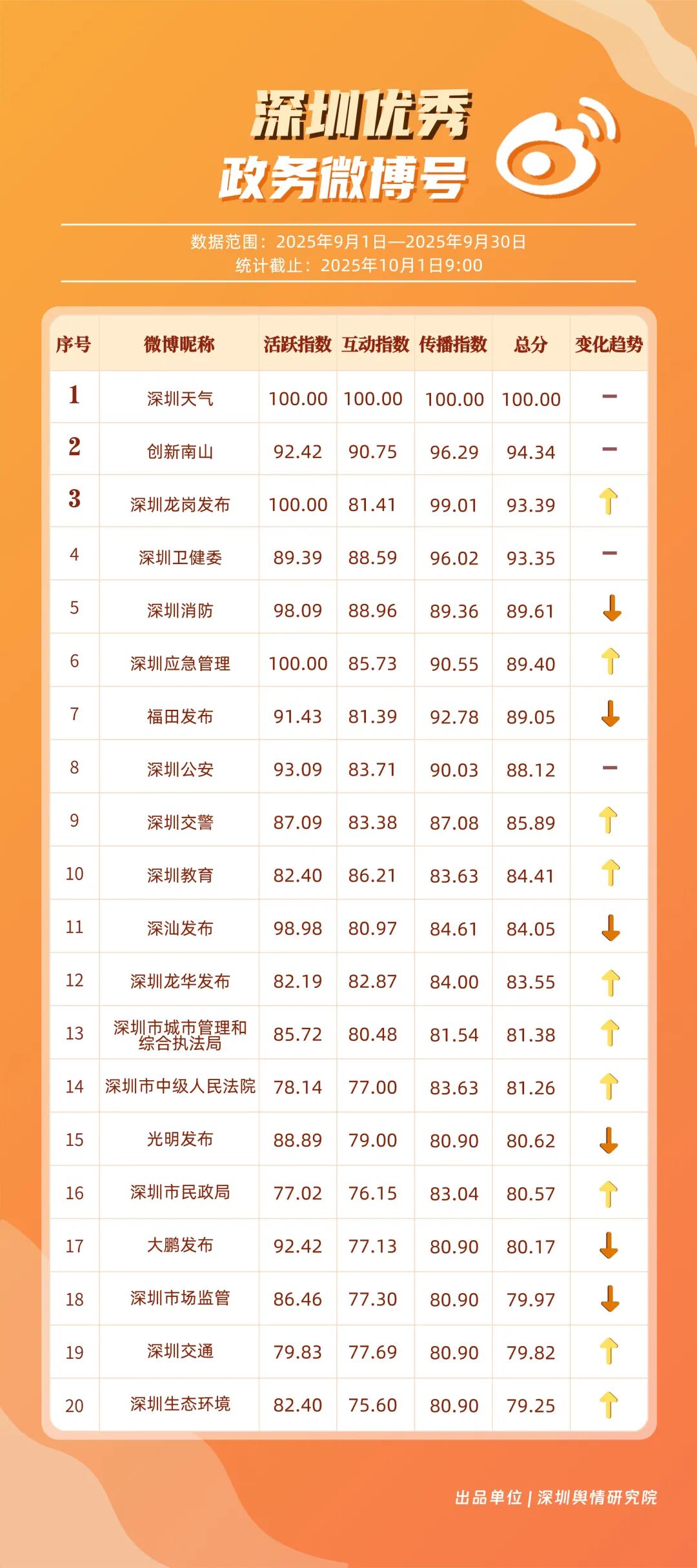 9月,20個賬號入選“優(yōu)秀政務微博號”榜單,其中包括:“深圳天氣”“創(chuàng)新南山”“深圳龍崗發(fā)布”“深圳衛(wèi)健委”“深圳消防”“深圳應急管理”“福田發(fā)布”“深圳公安”“深圳交警”“深圳教育”等。其中,“深圳天氣”蟬聯(lián)榜首,尤其9月出現(xiàn)臺風天氣,賬號受關注度再提升;“創(chuàng)新南山”賬號以多維度內容策略實現(xiàn)傳播效能提升,其內容中與歌手周深的聯(lián)動也成為一大亮點,獲得了較好傳播效果,以94.34分排名榜單第二;“深圳龍崗發(fā)布”“深圳衛(wèi)健委”兩賬號得分均在93分以上,在區(qū)域宣傳、內容科普方向發(fā)力。上榜優(yōu)秀微博賬號展現(xiàn)出較高的內容創(chuàng)新能力,以年輕化語態(tài)構建傳播體系,形成兼具專業(yè)性與傳播力的優(yōu)秀案例。