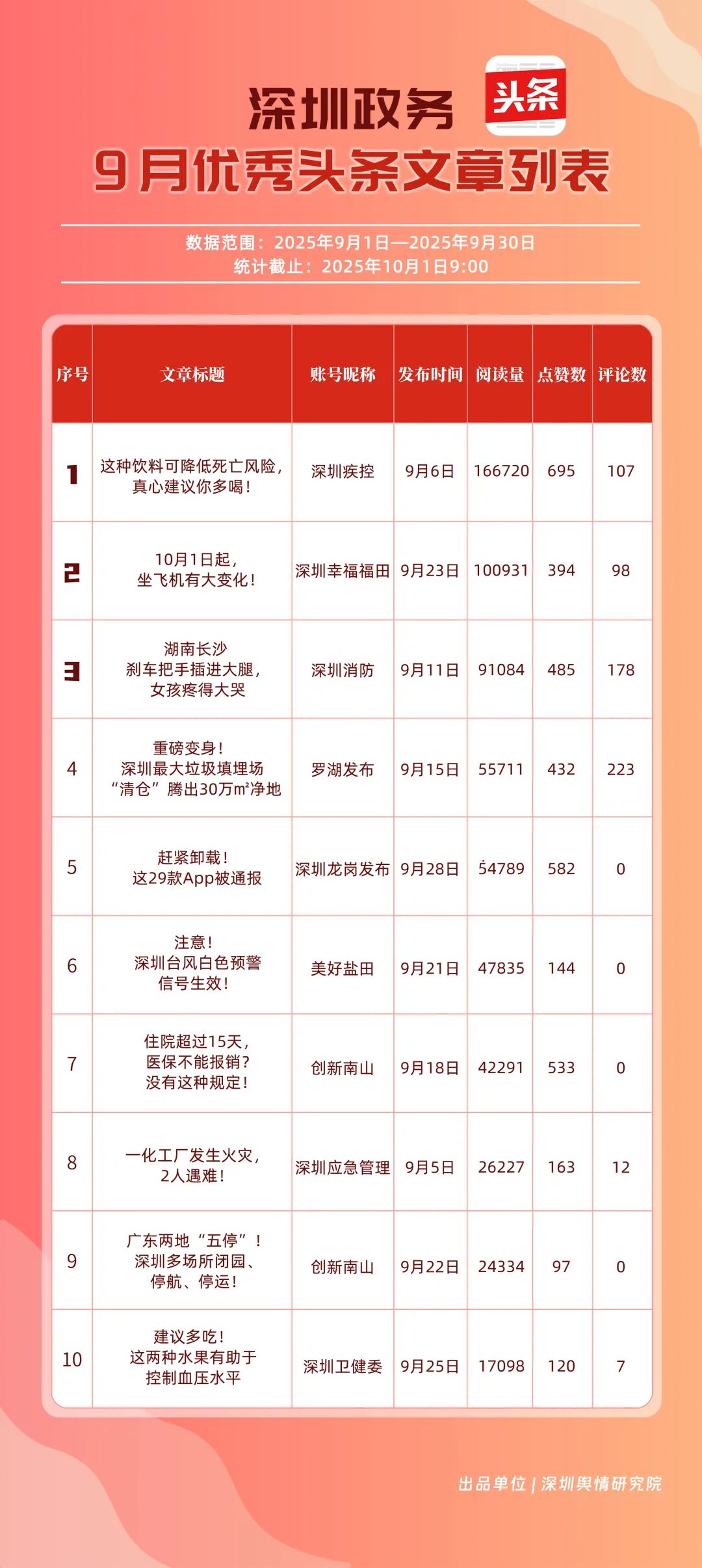 9月,“深圳幸福福田”“深圳疾控”“深圳消防”“羅湖發(fā)布”“深圳龍崗發(fā)布”“創(chuàng)新南山”“深圳龍華”“青春深圳”“深圳人社”“濱海寶安”共10個政務頭條號入選“優(yōu)秀政務頭條號”榜單?!吧钲谛腋8L铩狈€(wěn)居榜單首位,在傳播、互動等方面均表現(xiàn)卓越;“深圳疾控”關注民生健康,有關“喝茶的好處”“非正規(guī)醫(yī)美針風險”兩篇文章閱讀均超10萬次,為市民提供健康信息;“深圳消防”聚焦消防安全領域,提醒市民注意安全。相關上榜賬號表現(xiàn)優(yōu)異,注重內容實用化、互動場景化,彰顯了政務新媒體的服務效能。