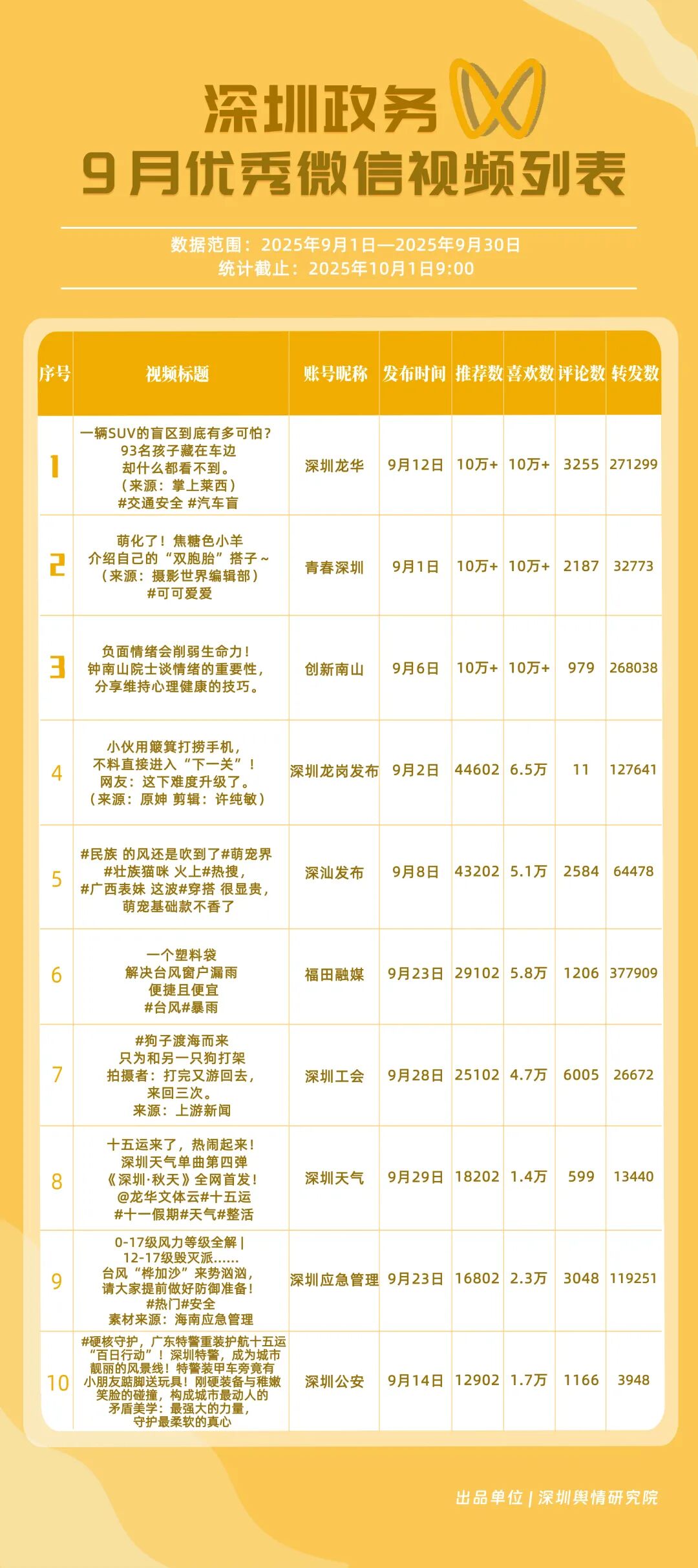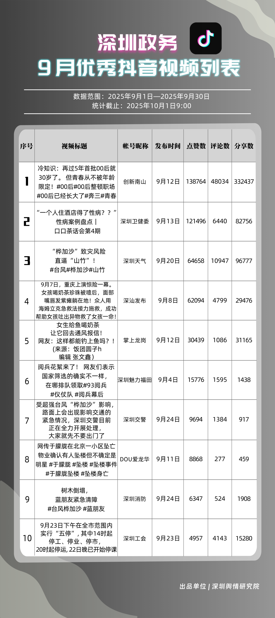 9月,獲得“優(yōu)秀政務抖音號”稱號的是“創(chuàng)新南山”“深圳天氣”“深圳衛(wèi)健委”“深圳魅力福田”“深汕發(fā)布”“掌上龍崗”“DOU愛龍華”“深圳工會”“青春深圳”“深圳交警”?!皠?chuàng)新南山”以一條有關“青春不被年齡限定”的視頻獲得超34萬次轉發(fā),超14萬次點贊,助力其在抖音榜單居于榜首;“深圳天氣”多條臺風相關視頻吸引大量網(wǎng)民關注、互動,在抖音平臺得分超98分;“深圳衛(wèi)健委”“深圳魅力福田”“深汕發(fā)布”等賬號緊隨其后,得分均在92分以上。上榜的優(yōu)秀政務抖音號以“有溫度”的敘事表達,將宣傳、服務內容轉化為網(wǎng)民喜聞樂見的視頻,收獲高點贊、高轉發(fā)的流量實績,更在評論區(qū)形成了良性互動生態(tài),深度運營收獲了較好成果。