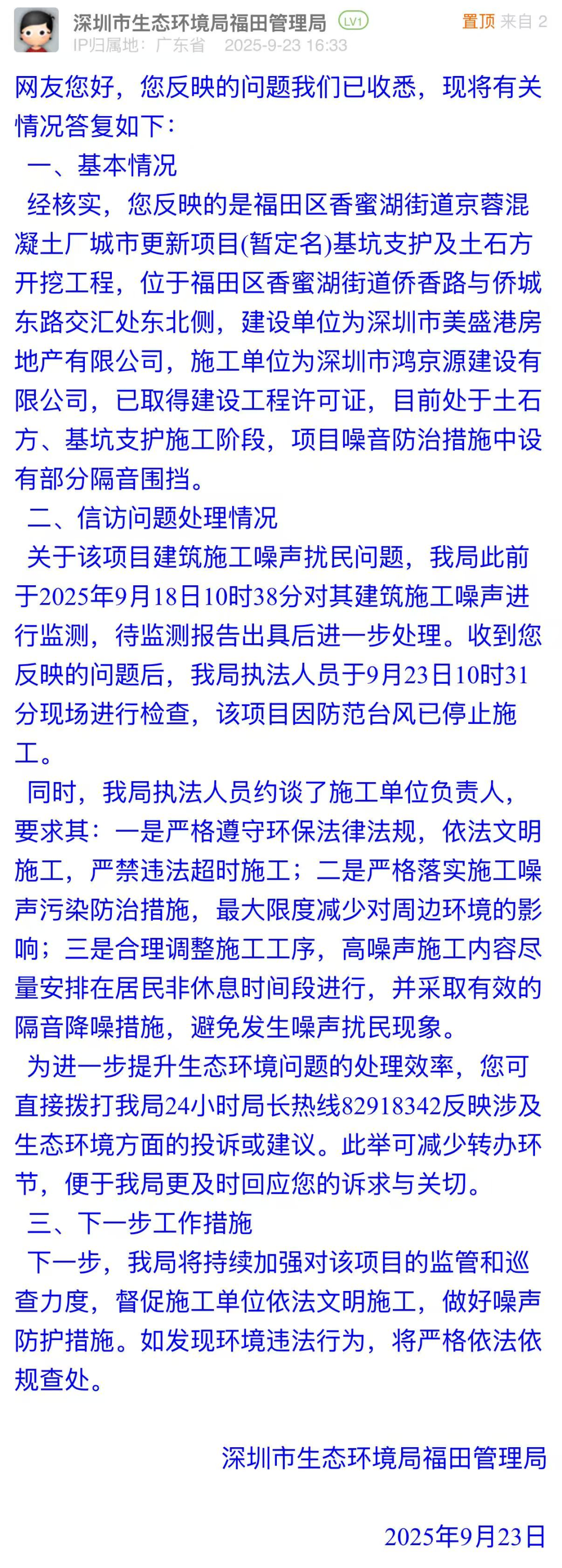 優(yōu)化建議:在訴求中,市民表示施工噪音可以忍耐,但希望“灰塵大”情況可以得到緩解,并附圖展示現(xiàn)場(chǎng)情況。市生態(tài)環(huán)境局福田管理局在回應(yīng)中,僅聚焦建筑施工噪聲,對(duì)“灰塵污染”只字未提,與市民訴求脫節(jié)。建議后續(xù)提高訴求匹配度,用務(wù)實(shí)的態(tài)度回應(yīng)市民對(duì)居住環(huán)境、城市建設(shè)的關(guān)切,避免因回應(yīng)不完整引發(fā)新的治理信任問(wèn)題。