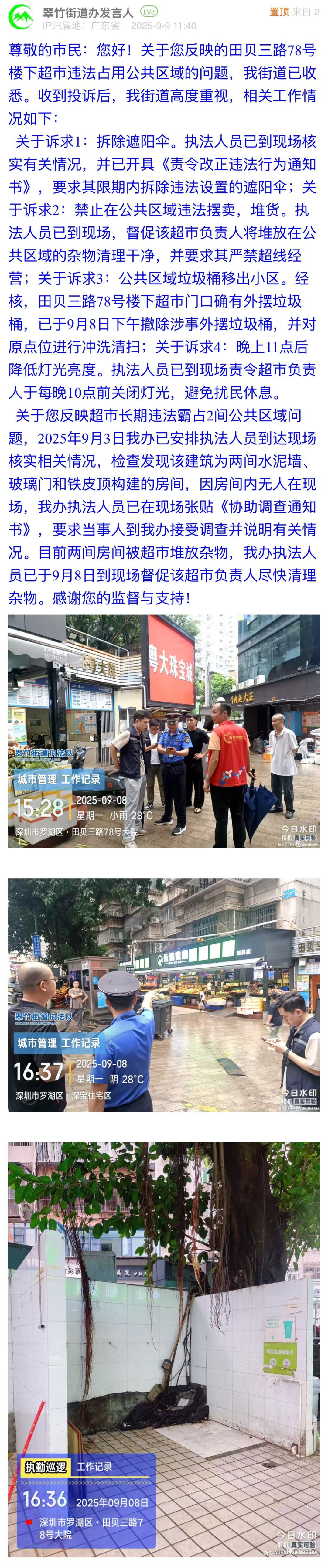 案例點(diǎn)評(píng):本案例中,翠竹街道辦立足市民訴求,對(duì)違規(guī)搭建遮陽(yáng)傘、占用公共區(qū)域、違規(guī)堆放垃圾、店面燈牌亮度過(guò)高這四個(gè)問(wèn)題,街道均做到快速響應(yīng),并以圖片展示治理效果。回應(yīng)既體現(xiàn)了基層執(zhí)法的規(guī)范性與時(shí)效性,又展現(xiàn)了對(duì)民生細(xì)節(jié)的關(guān)注力,踐行了“小事不小辦、事事有回音”的理念,為同類民生訴求的解決提供了可借鑒范式。