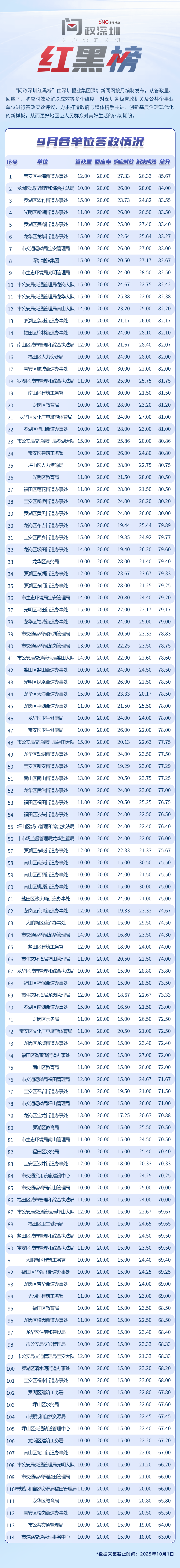為探尋媒體如何精準(zhǔn)賦能基層治理現(xiàn)代化的“深圳路徑”,深圳報(bào)業(yè)集團(tuán)正式掛牌成立“問(wèn)政深圳”工作室,旨在進(jìn)一步推動(dòng)網(wǎng)絡(luò)問(wèn)政工作的高效開(kāi)展。為確保相關(guān)工作更加契合實(shí)際需求,自上期起,深圳報(bào)業(yè)集團(tuán)深圳新聞網(wǎng)按照“最快速度辦結(jié)”的總體要求,將原有月度榜單創(chuàng)新升級(jí)為“問(wèn)政深圳紅黑榜”,并對(duì)評(píng)分體系進(jìn)行了細(xì)致優(yōu)化。該榜單從答政量、回應(yīng)率、響應(yīng)時(shí)效及解決成效等多個(gè)維度,對(duì)深圳各級(jí)黨政機(jī)關(guān)及公共企事業(yè)單位進(jìn)行答政實(shí)效評(píng)議,力求打造政府與媒體攜手共進(jìn)、創(chuàng)新基層治理現(xiàn)代化的新樣板,從而更好地回應(yīng)人民群眾對(duì)美好生活的熱切期盼。