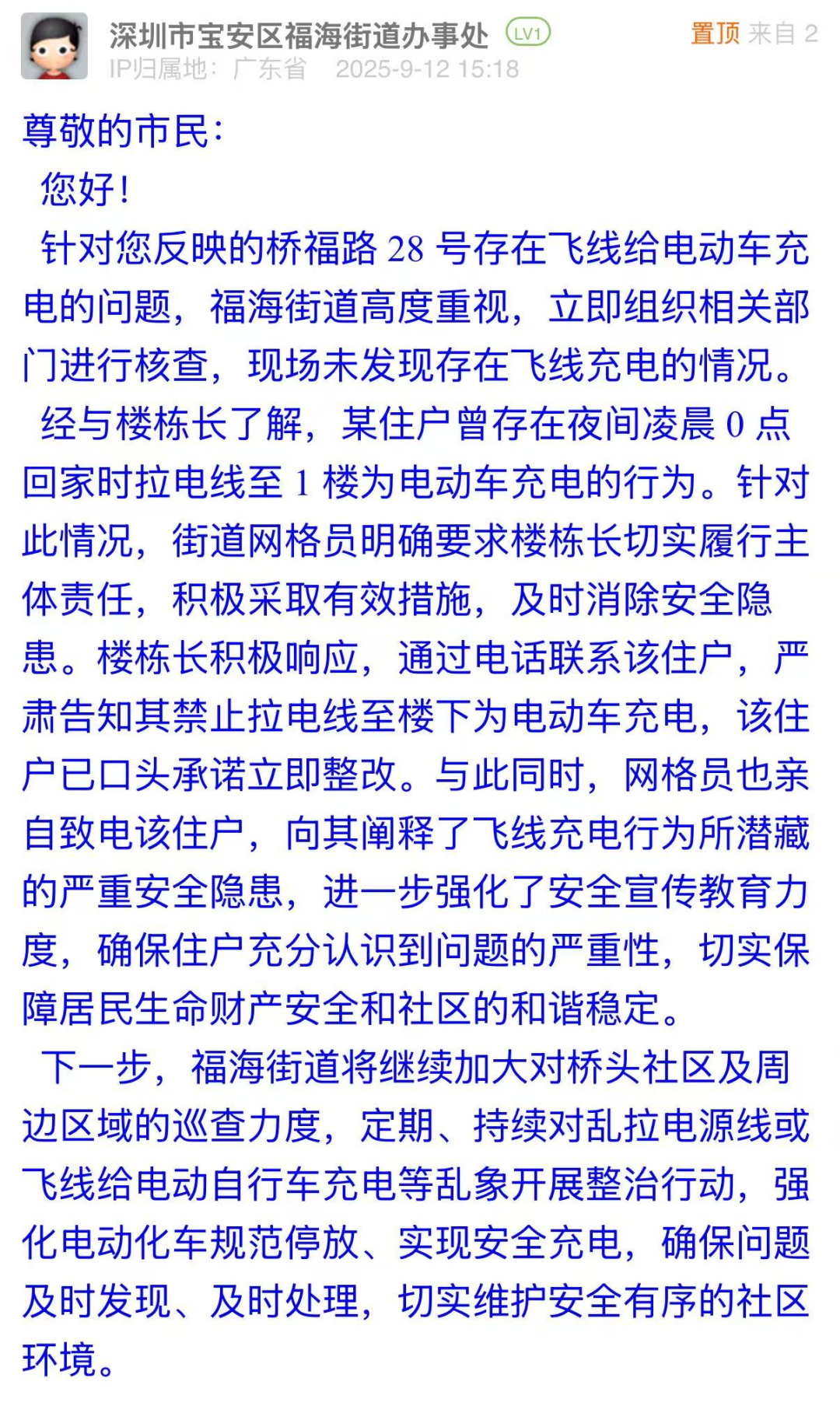 案例點(diǎn)評(píng):福海街道辦對(duì)電動(dòng)車“飛線充電”問(wèn)題展現(xiàn)出快速響應(yīng)、權(quán)責(zé)明晰的治理態(tài)度,第一時(shí)間組織核查,既明確主體責(zé)任、嚴(yán)令整改,又細(xì)致開(kāi)展安全教育,讓住戶充分認(rèn)知“飛線充電”的嚴(yán)重危害,體現(xiàn)執(zhí)法和普法的雙重?fù)?dān)當(dāng)?;貞?yīng)中,街道辦還表示將強(qiáng)化巡查力度、開(kāi)展整治行動(dòng),建立長(zhǎng)效治理機(jī)制,維護(hù)社區(qū)安全秩序,彰顯了基層治理中“問(wèn)題導(dǎo)向、標(biāo)本兼治”的治理邏輯。