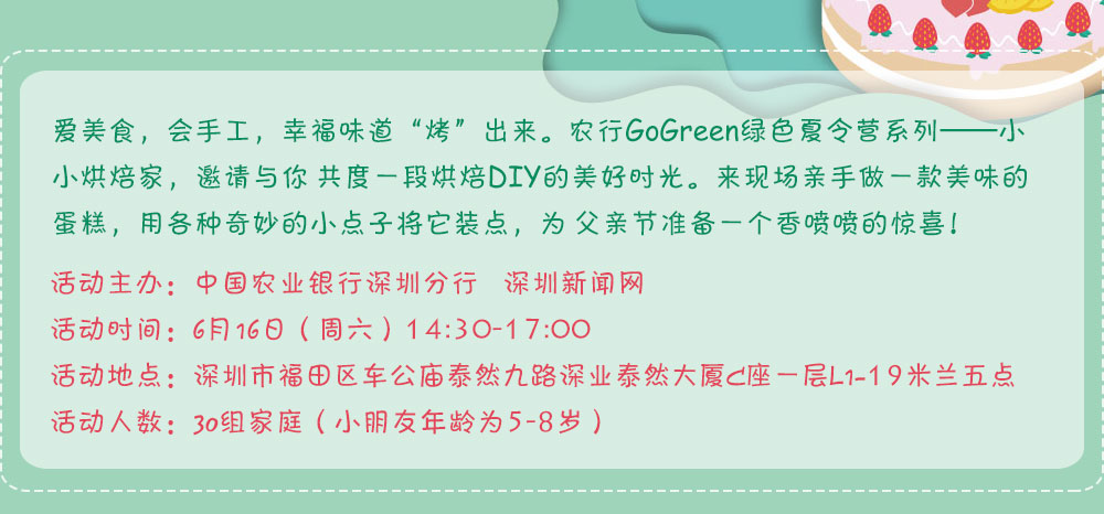 6月16日下午,中國農(nóng)業(yè)銀行深圳市分行聯(lián)合深圳新聞網(wǎng)開展了一場(chǎng)以親子體驗(yàn)為主題的Go Green綠色夏令營之“小小烘焙家”活動(dòng),讓孩子們通過DIY蛋糕培養(yǎng)動(dòng)手能力和創(chuàng)造能力,為爸爸送上一份特別的父親節(jié)禮物。[詳細(xì)]